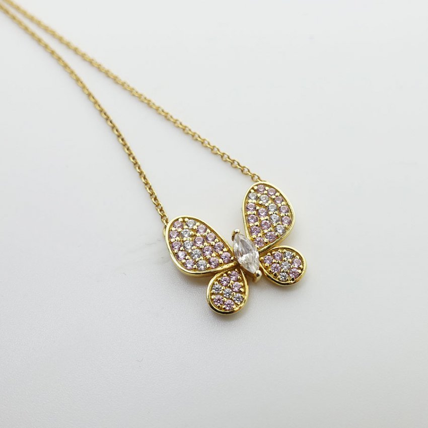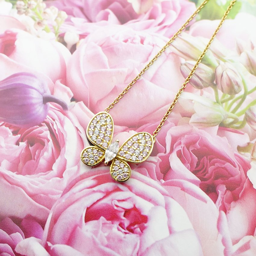 蝶の羽部分にピンクとホワイトの人工ダイヤモンドを使用しました。柔らかく可愛らしい雰囲気に。光の加減で淡いピンクがキラキラします。