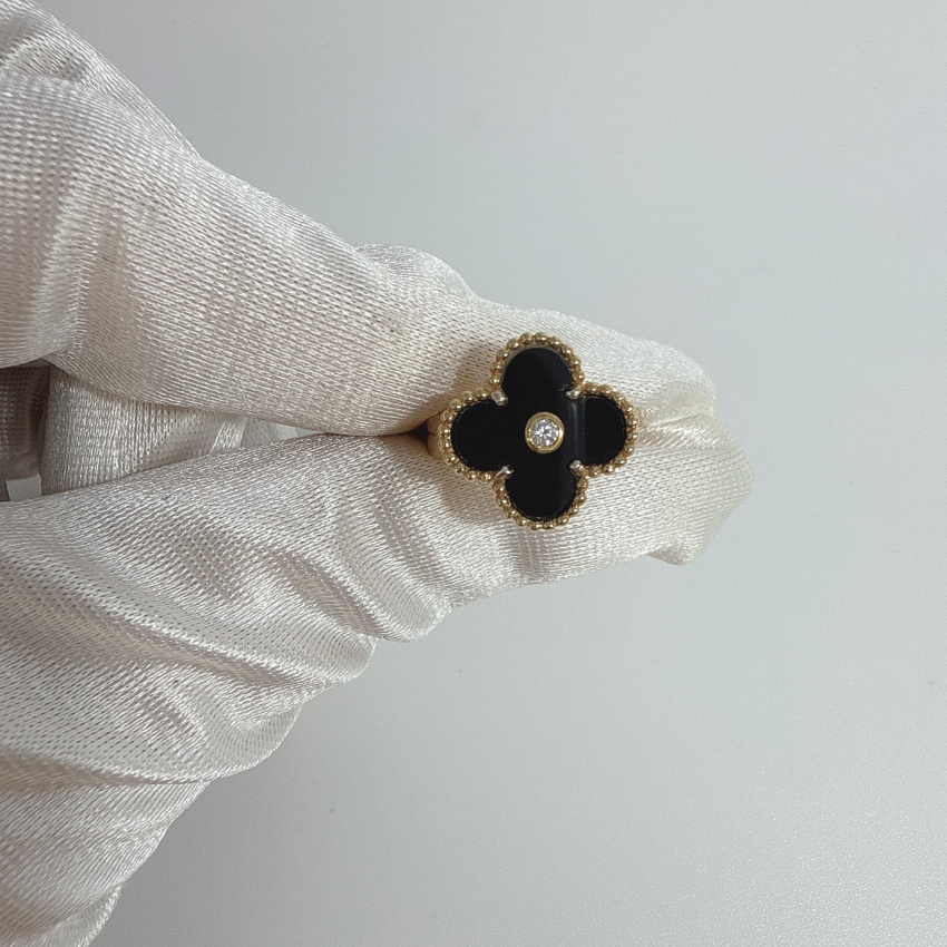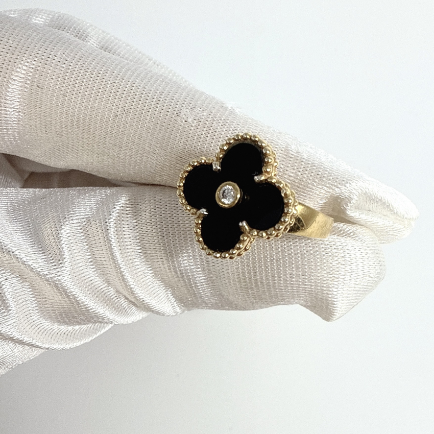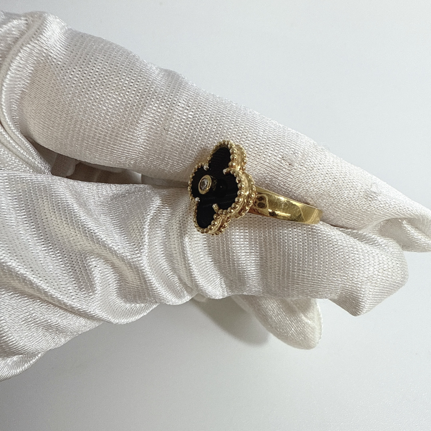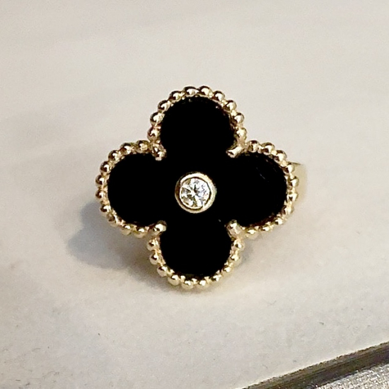 【サンプル アウトレット品】定価42,900円破格→ クローバーリング オニキス・ゴールドカラー ※サイズ 7号、8号  備考欄に希望号数を記載下さい